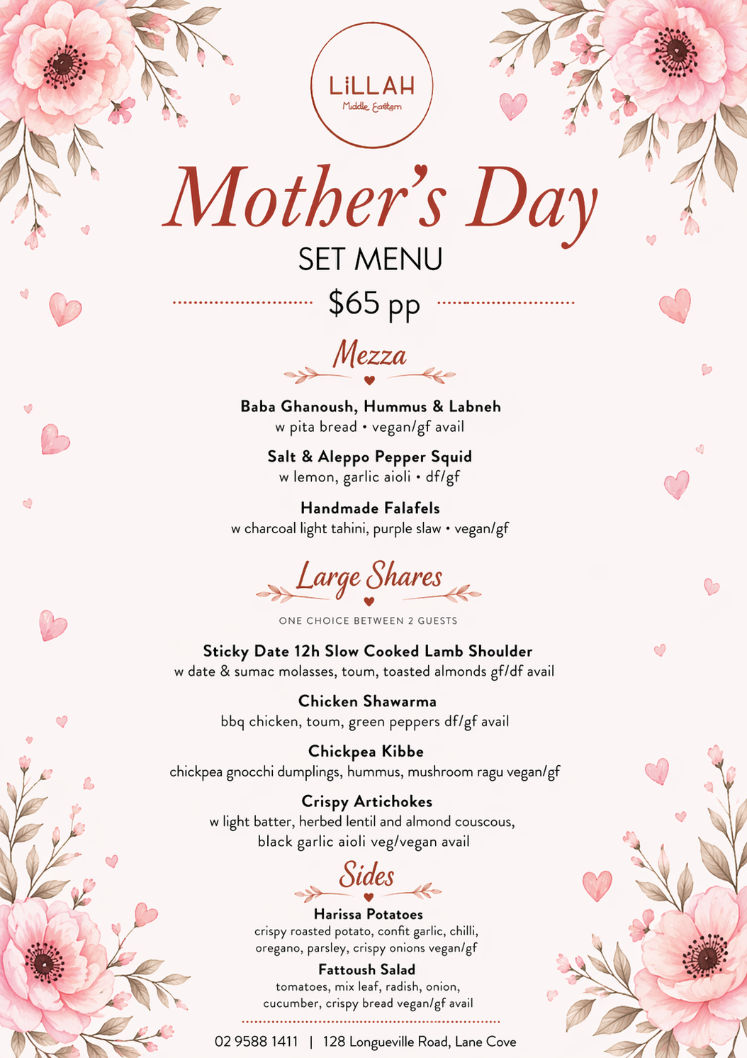 Celebrate Mum with a warm, flavour-filled experience at Lillah Kitchen. This Mother’s Day, we’re serving a specially curated set menu designed to bring people together over generous Middle Eastern-inspired dishes, bold flavours, and comforting classics.
